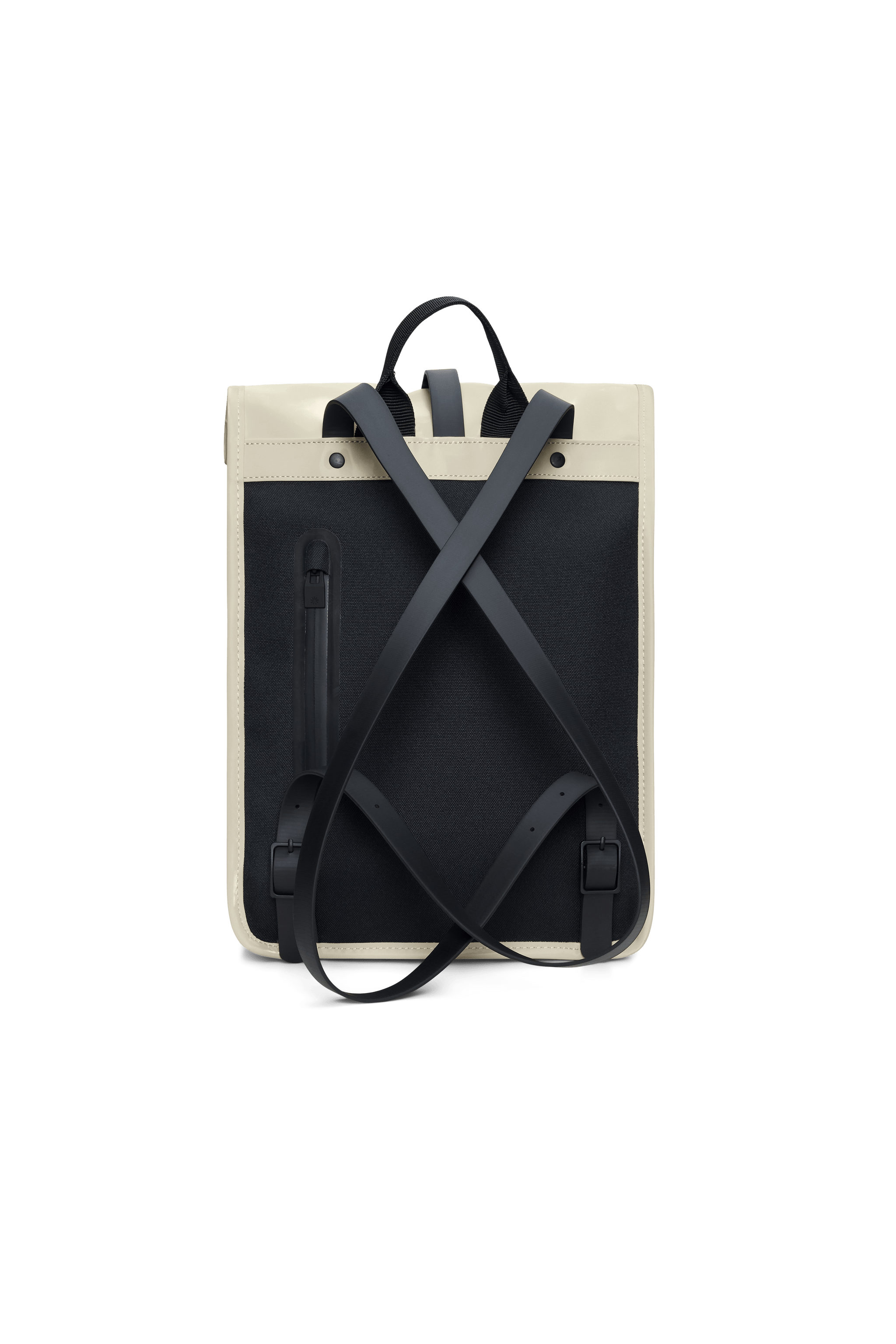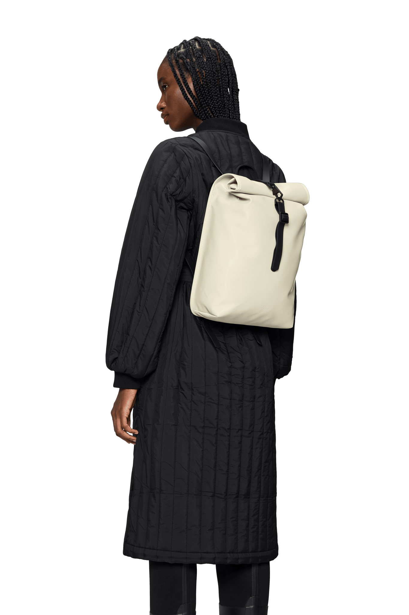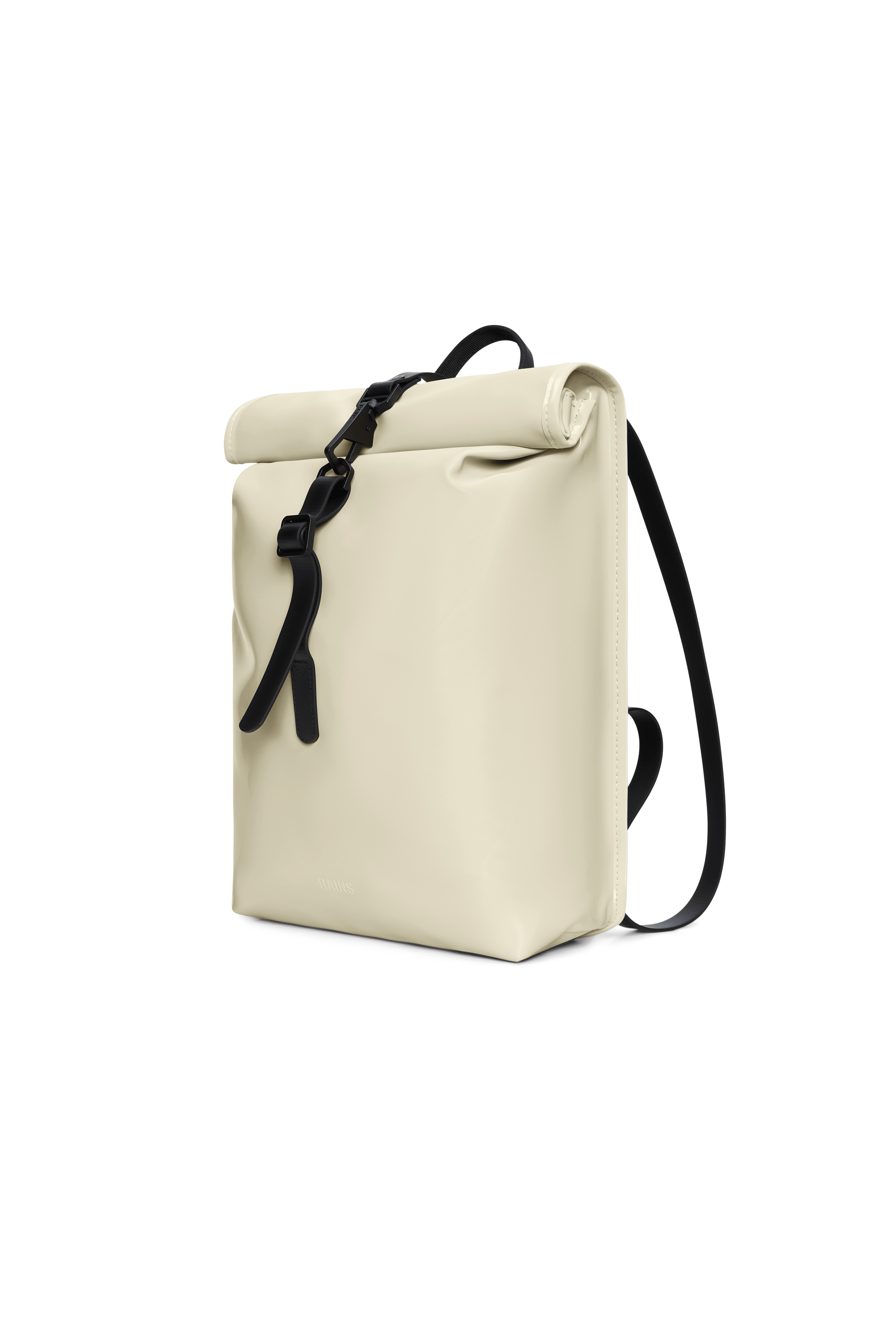 Rolltop-Rucksack ist aus Rains' charakteristischem PU-Stoff gefertigt, der für Tragfestigkeit, Haltbarkeit und ein geschmeidiges Gefühl entwickelt wurde.