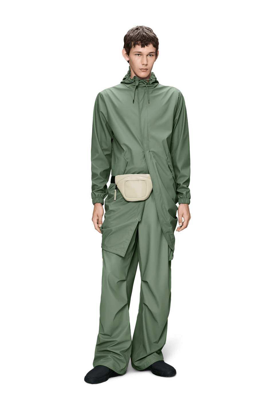 Diese Regenjacke ist aus Rains' charakteristischem PU-Stoff geschnitten und verfügt über geschweißte Nähte. Das Finish ist leicht und fühlt sich glatt an.