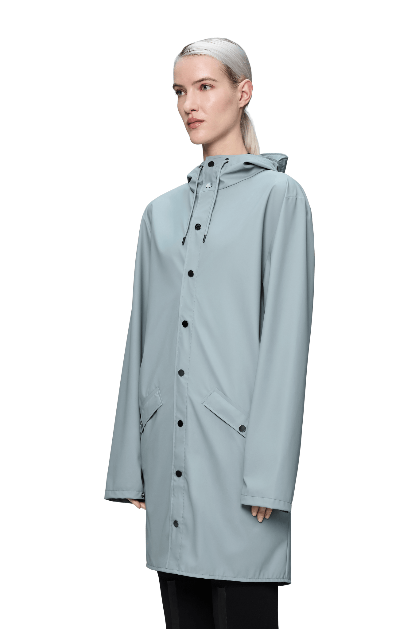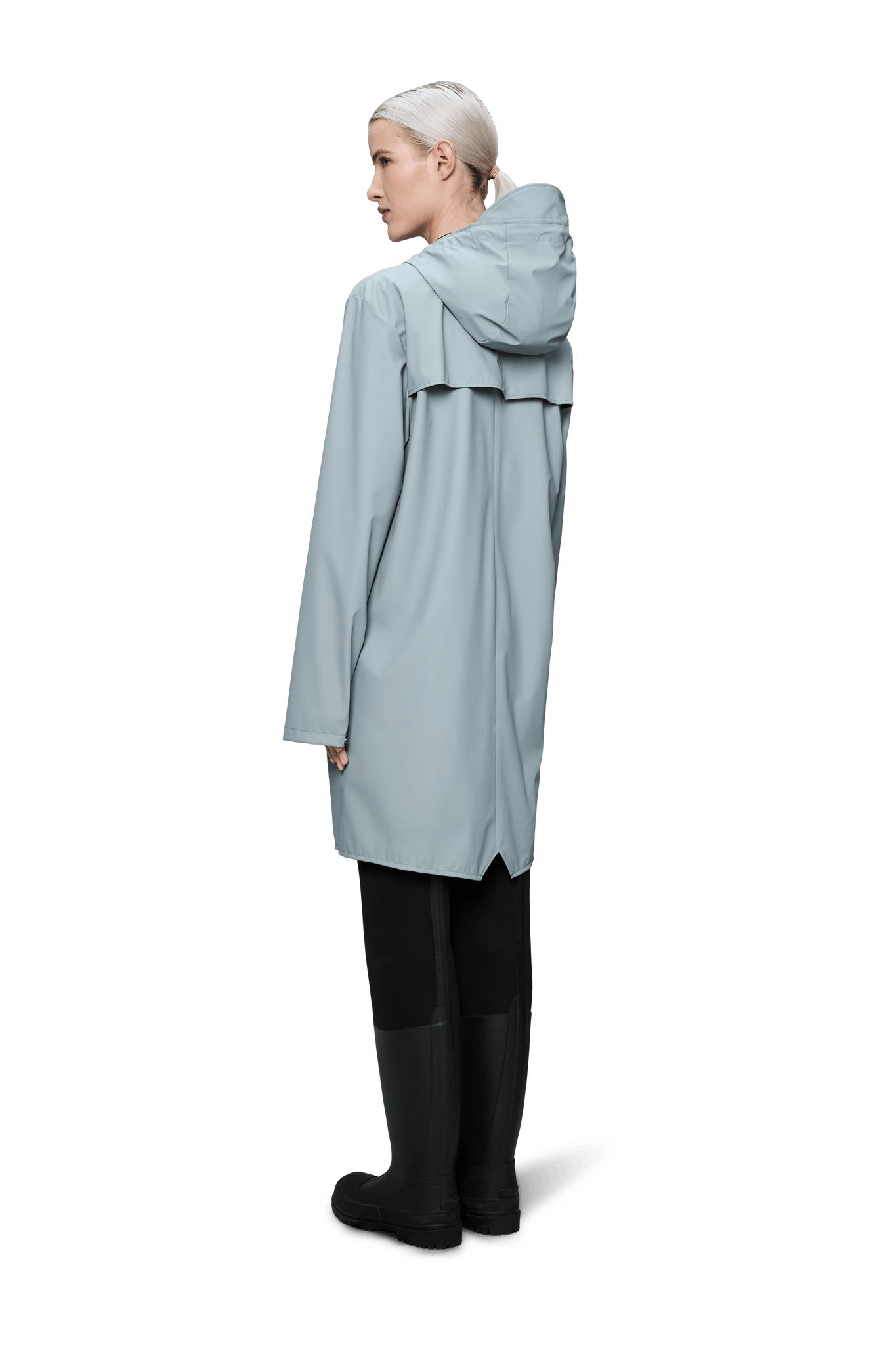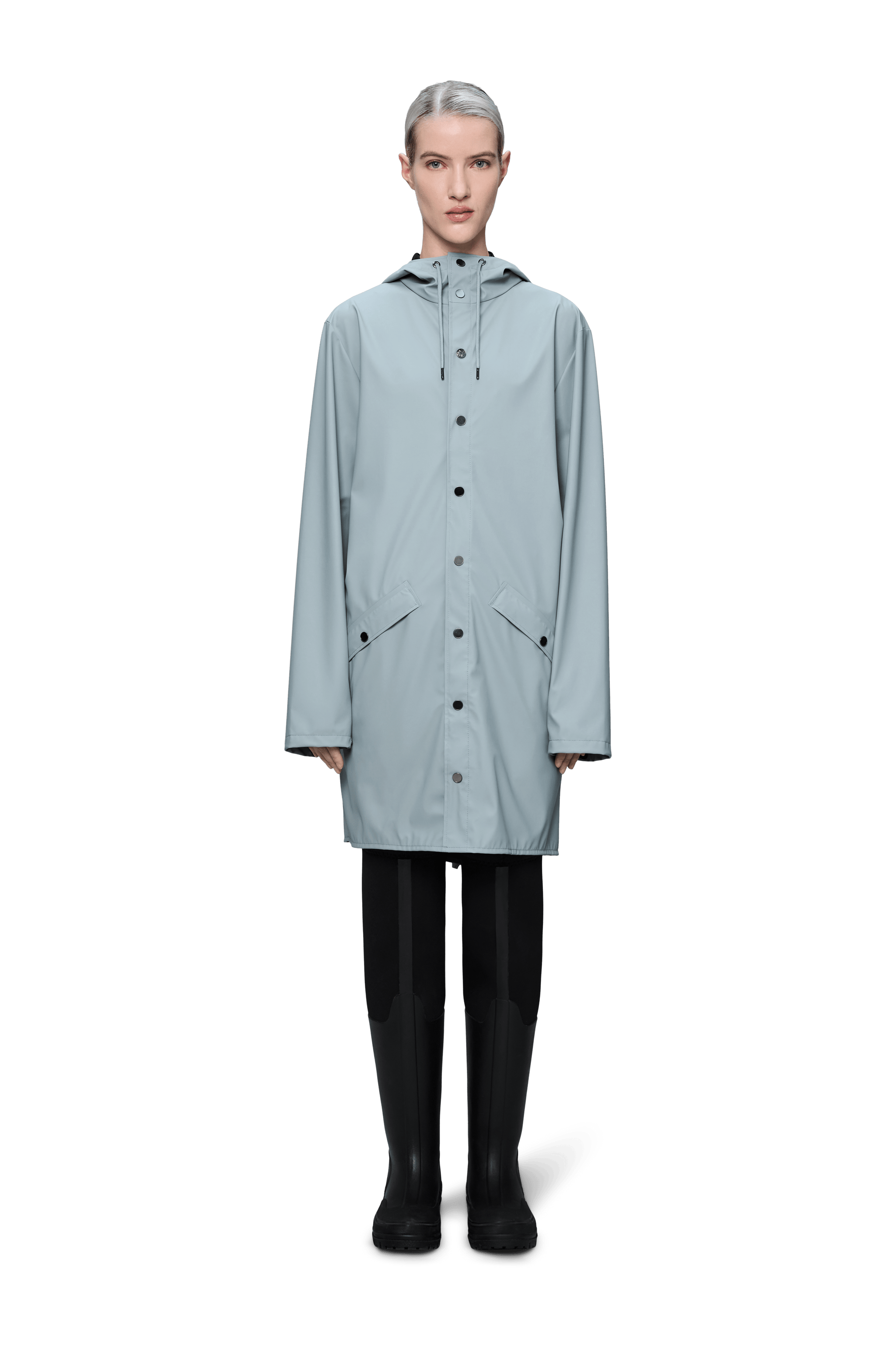 Long Jacket ist eine stets zeitgenössische Unisex-Regenjacke. Gekennzeichnet durch eine minimale Silhouette in einem langen Design.