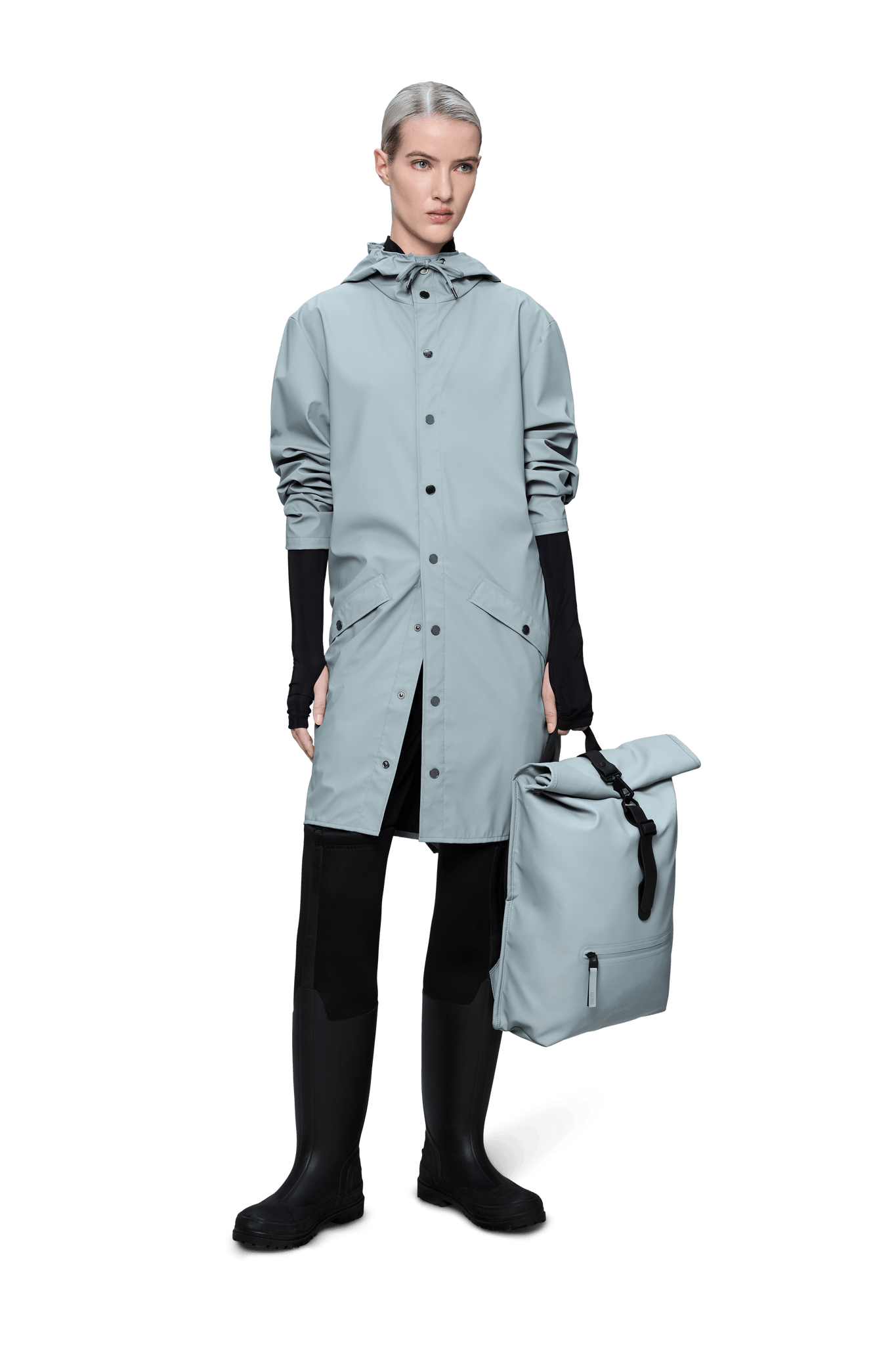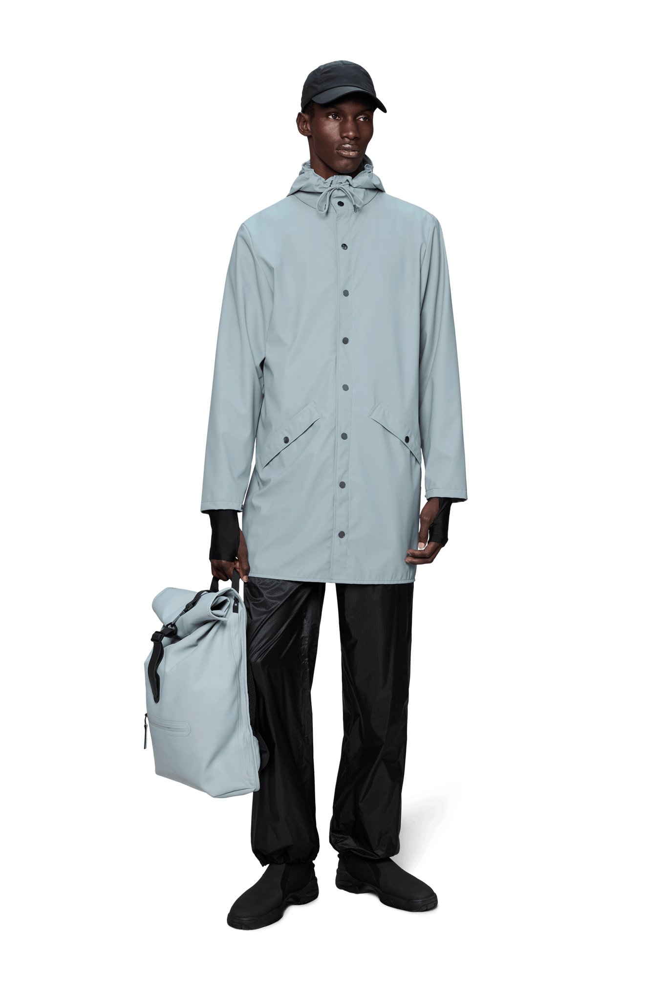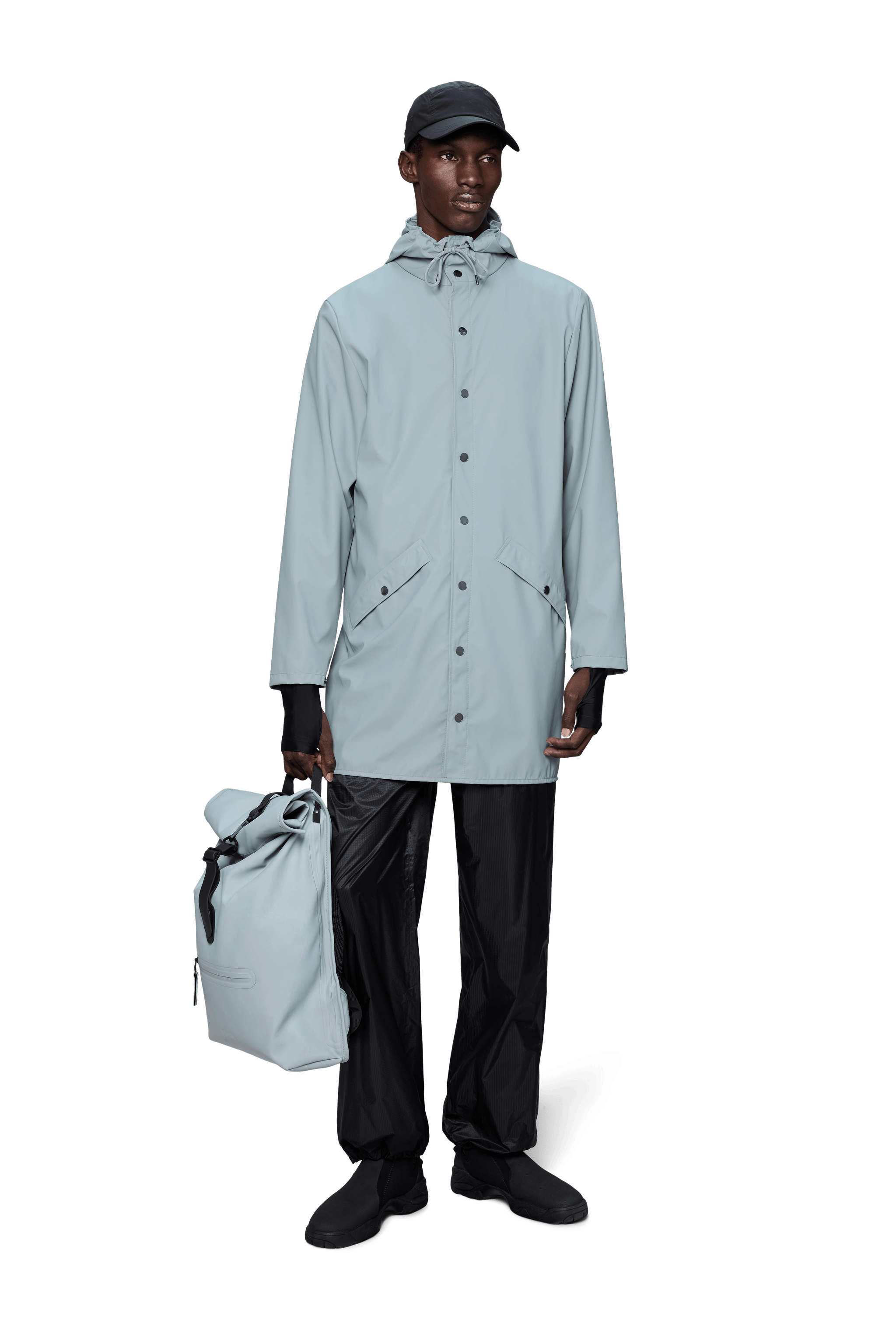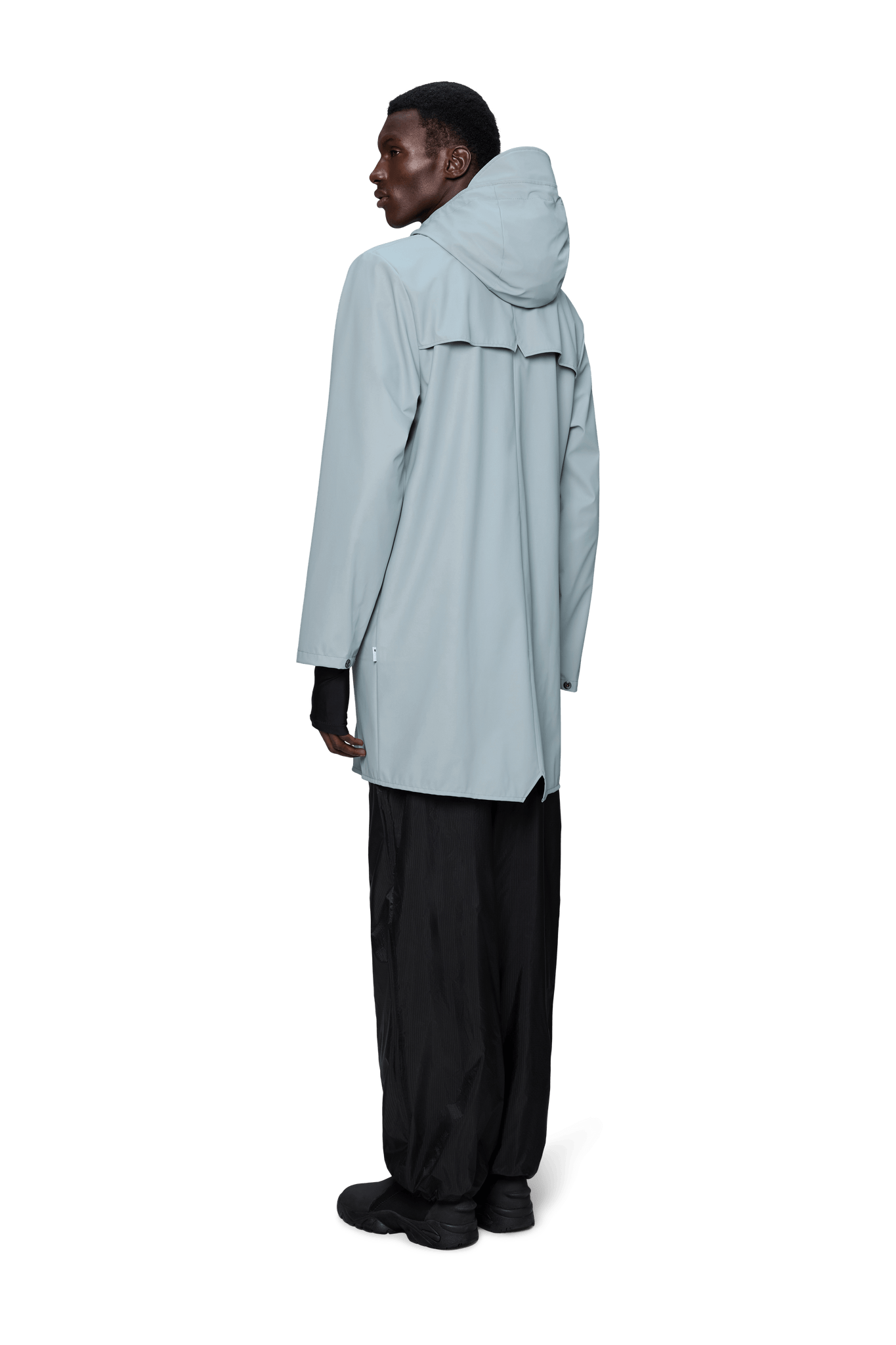 Long Jacket ist eine stets zeitgenössische Unisex-Regenjacke. Gekennzeichnet durch eine minimale Silhouette in einem langen Design.